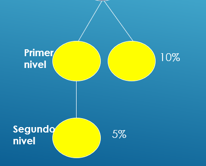 También podrás ganar de las personas que inviten tus patrocinados personales, es decir, Empresarios Independientes en 2º nivel. Al tener 2 Empresarios Independientes de 1er nivel con compra, ganarás un 5% sobre las compras realizadas por los Empresarios Independientes de tu 2º nivel. | |
