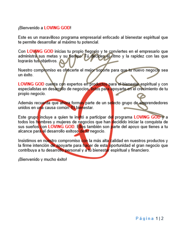 El programa de LOVING GOD incluye la oportunidad de tener ganancias adicionales a tus ventas invitando nuevos Empresarios Independientes al programa. | |